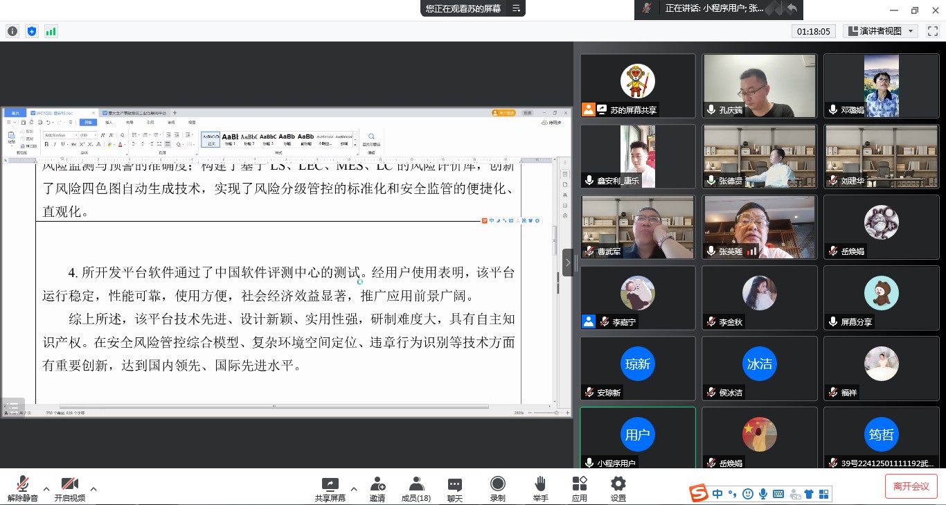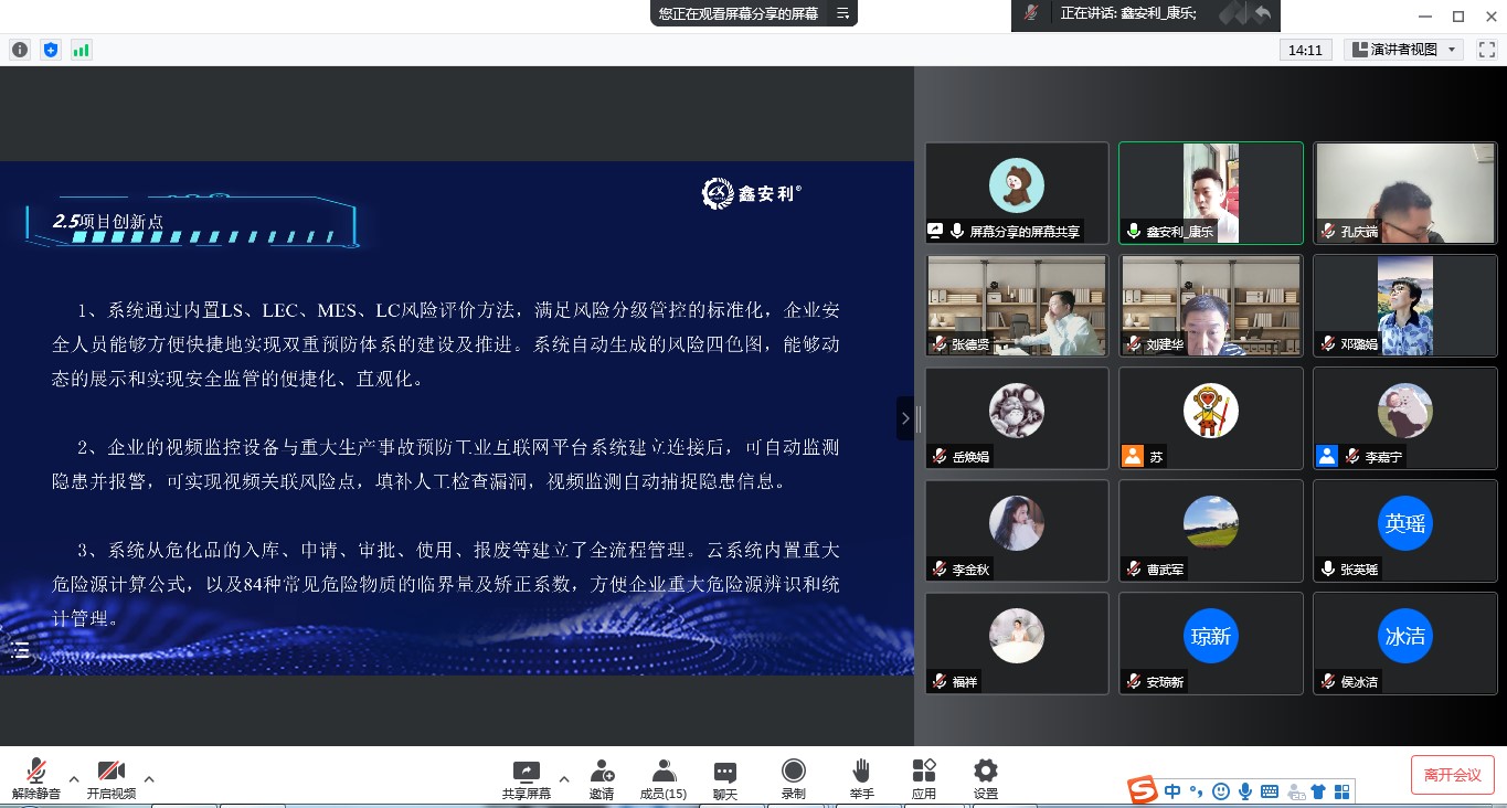公司副總裁、本項目負責人孔慶端對公司基于工業互聯網平臺關鍵技術,向市場輸出的智慧安全示范園區、智慧雙重預防系統、網格化監管平臺等多條產品線及目前的應用情況進行了匯報,尤其是基于十四五規劃里提出的危化行業智能巡檢、作業管控、人員定位和基層安全網格化治理理念等新應用場景,與在會專家組進行了深入探討。評價專家組對鑫安利在推動行業發展及安全領域中所做出的貢獻給予了高度贊揚,對本科技成果的研發給予了充分肯定。專家組認為,該平臺技術架構新、底層邏輯強、結合鑫安利公司輸出的諸多產品體系,其社會經濟效益會更加顯著、推廣應用前景更加廣闊,并建議加快在基層公共安全的推廣應用。