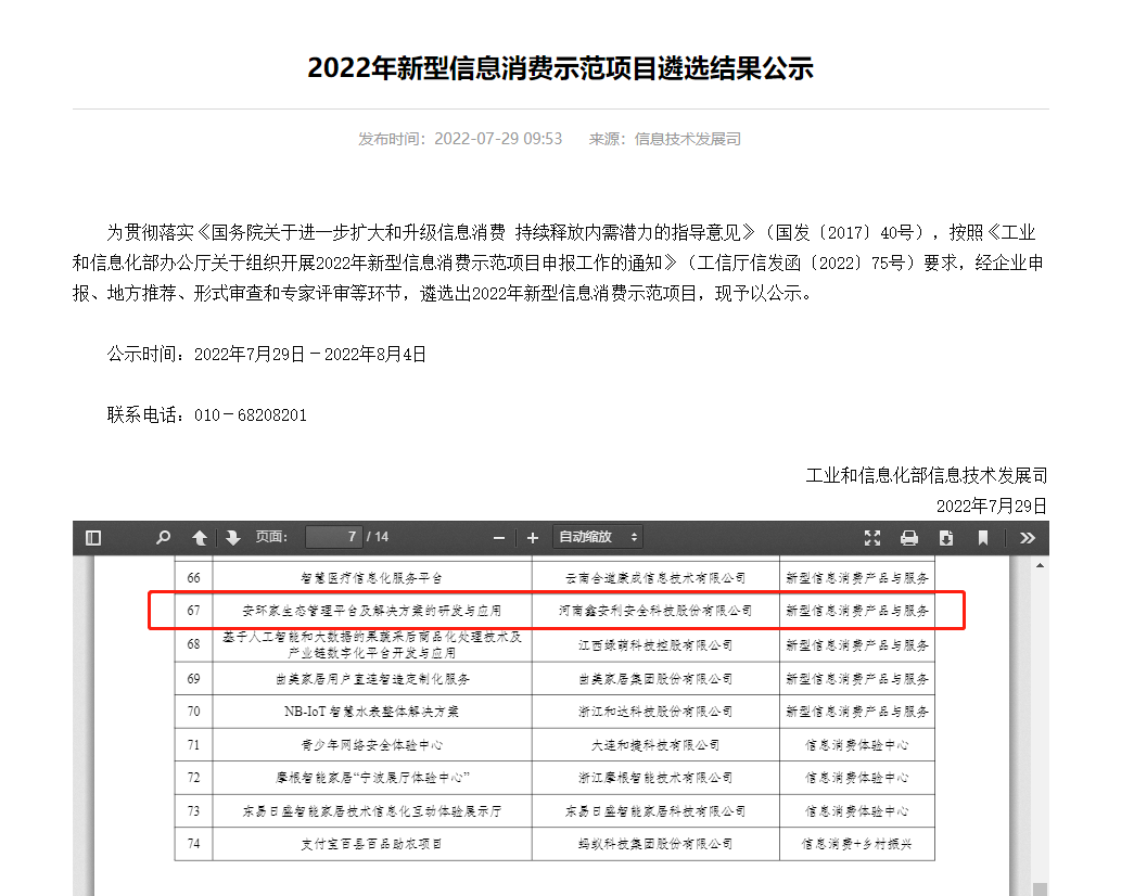 7月29日,由國家工信部組織的2022年新型信息消費(fèi)示范項(xiàng)目遴選結(jié)果公示,我公司河南鑫安利安全科技股份有限公司申報的“安環(huán)家生態(tài)管理平臺及解決方案的研發(fā)與應(yīng)用”項(xiàng)目成功入選。