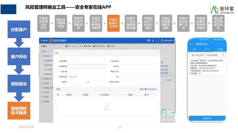 另外安全風險管理師可以開展哪些業務?田主任在“企業全程安全風險管理服務解決方案”課題中提到,新《安全生產法》的實施,都提到了事故預防服務的重要性,安全風險管理師除了可以為企業開展安責險事故預防服務以外,還可以借助安環家平臺為企業輸出風險辨識與評估、風險管理與控制、風險轉移等全程安全風險管理服務,通過多重業務模式,實現多重盈利。