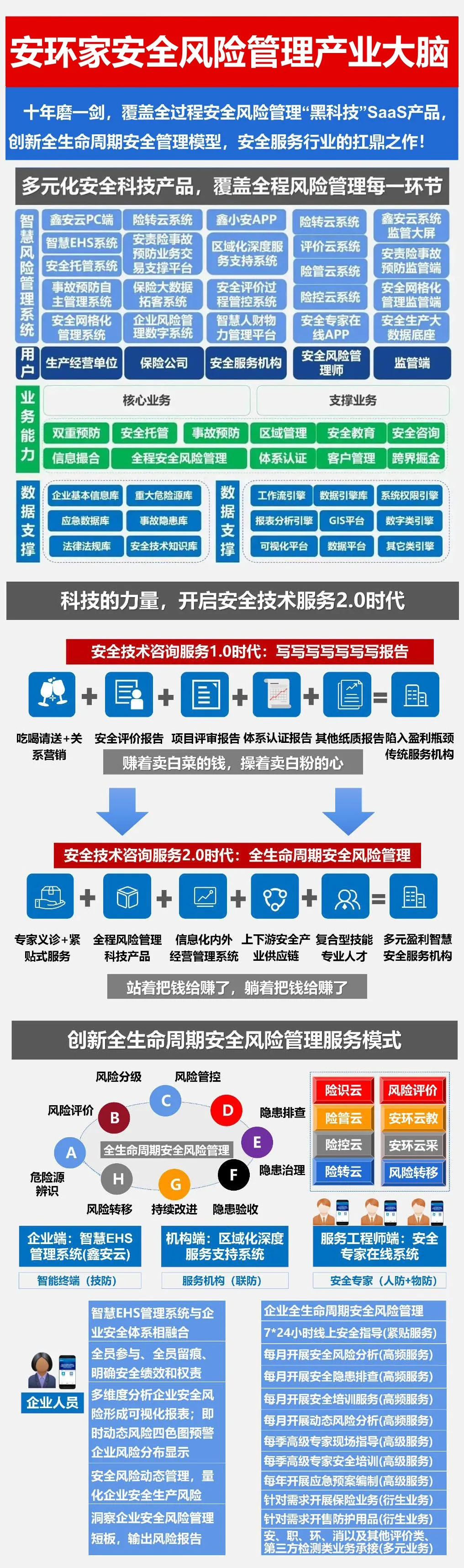 安環(huán)家的使命就是通過(guò)建立安全風(fēng)險(xiǎn)管理產(chǎn)業(yè)大腦,助力服務(wù)機(jī)構(gòu)數(shù)智升級(jí),實(shí)現(xiàn)華麗轉(zhuǎn)身和彎道超車,最終實(shí)現(xiàn)全行業(yè)繁榮共生和共同富裕。
