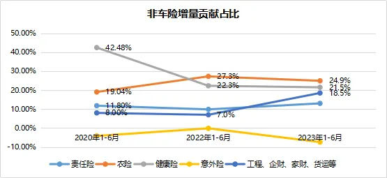 據數據顯示,當前非車險對財險市場的貢獻有大幅提升,增量貢獻達到70.63%,同比提升4個百分點。此外責任險增量貢獻逐年上升,政府將責任險作為社會治理的重要工具,通過出臺制度強制要求企業購買或通過補貼鼓勵企業購買安責險、雇主責任險等險種,責任險增量貢獻達到13%,比去年同期提升3個百分點。