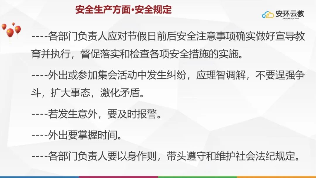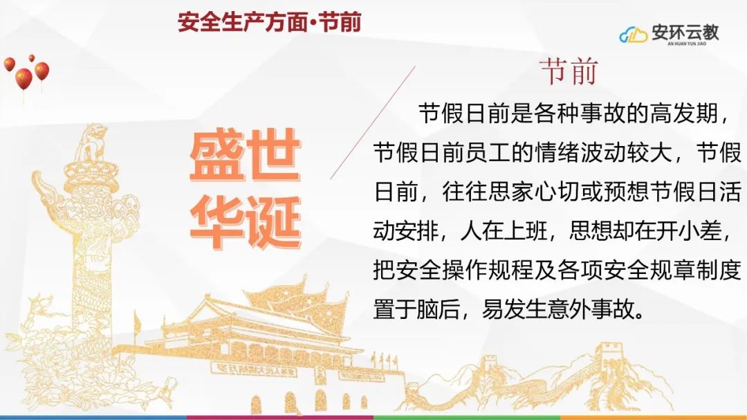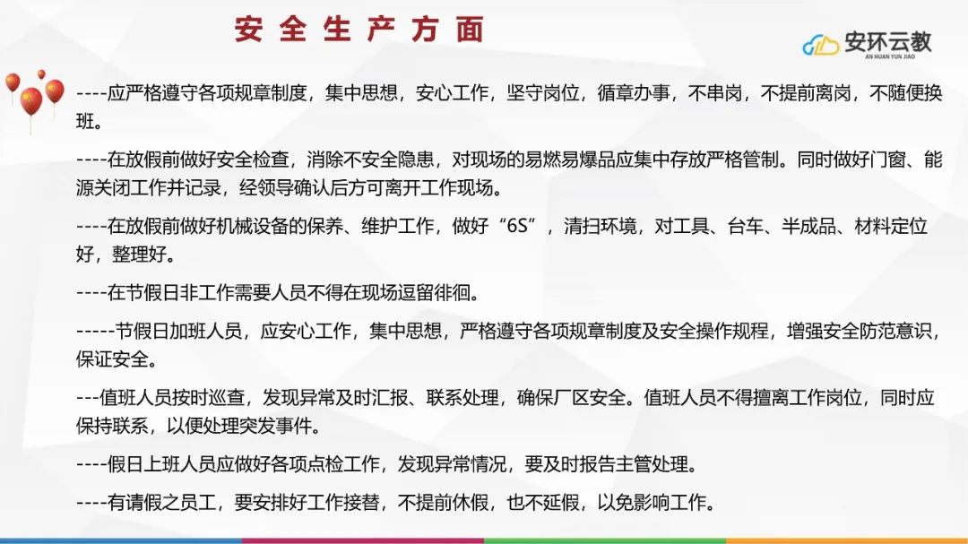 在十一假期來臨之際,為了保證大家渡過愉快、祥和、安全的假期,減少節(jié)假日前后及節(jié)假日安全事故的發(fā)生,安全從業(yè)人員必須要遵守安全生產(chǎn)、危險作業(yè)、消防安全、用電安全、交通安全、新冠疫情等方面的注意事項。