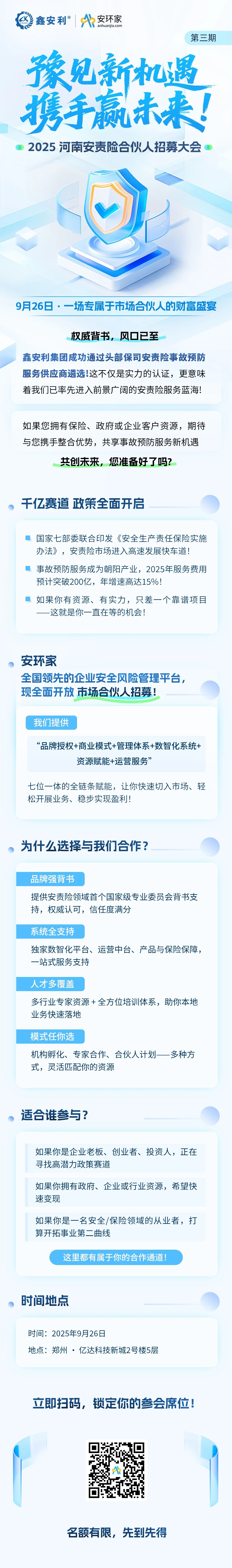 為此,9月26日,將舉辦第三期“豫見(jiàn)新機(jī)遇?攜手贏未來(lái)”——河南安責(zé)險(xiǎn)合伙人大會(huì),面向河南全省招募合作伙伴,廣邀行業(yè)翹楚攜手分享市場(chǎng)紅利。