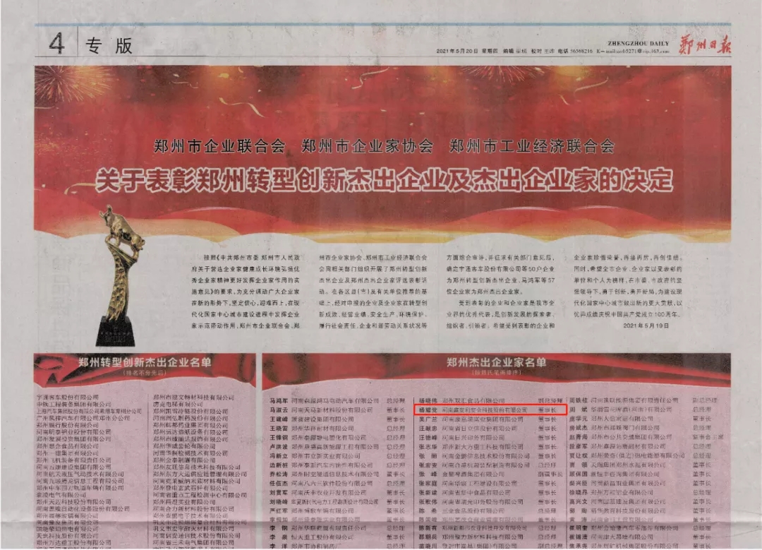 5月19日,由鄭州市企業聯合會、鄭州市企業家協會、鄭州市工業經濟聯合會舉辦的“2021年全國企業家活動日鄭州分會場活動”在河南省黃河迎賓館會議中心隆重舉行。會議對“鄭州轉型創新杰出企業及杰出企業家”等進行了表彰和頒獎,河南鑫安利安全科技股份有限公司董事長兼總裁楊耀黨榮膺鄭州“杰出企業家”稱號。