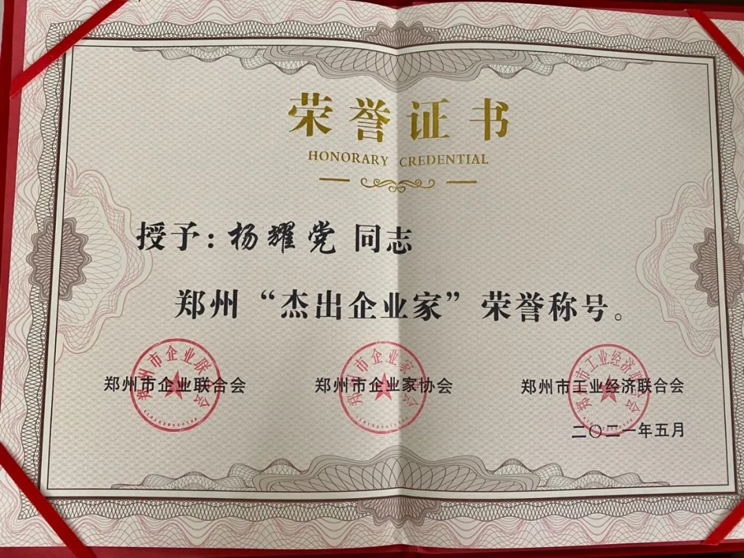 △ 楊董事長“鄭州杰出企業家”榮譽證書